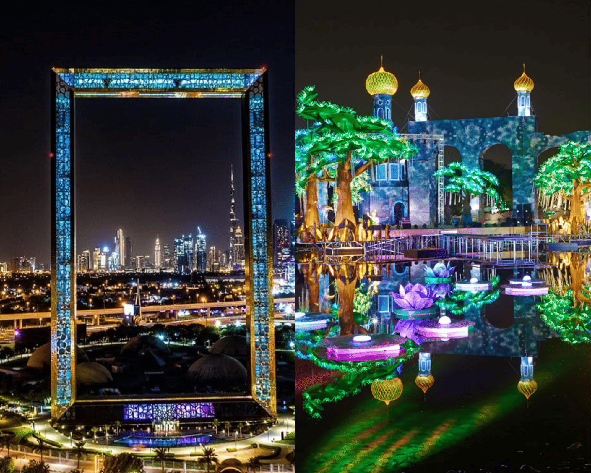 Enjoy the stunning view of Dubai from Dubai Frame and spend the evening watching art and light at Dubai Garden Glow